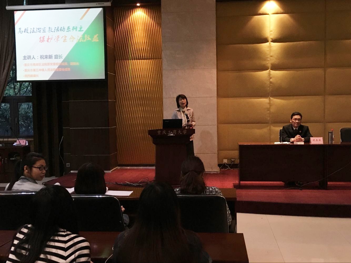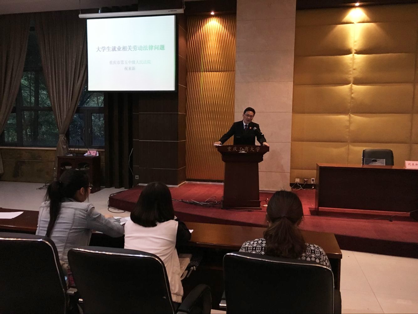 2016年4月26日晚,高校法治宣教活动系列之保护学生合法权益法律讲座在田家炳书院408报告厅成功召开。重庆市南岸区法院原党委组织成员、副院长,重庆市第五中级人民法院省委会成员、民四庭庭长祝来新;原重庆市南岸去法院副院长、原重庆市第五中级人民法院宣教处副处长陈绍惠受邀就大学生就业相关劳动法律问题进行知识宣讲。财政beat365在线唯一官网党总支杨萍书记、分团委徐阔书记、校友联络员杨佳妮及校友代表张明佳出席了本次讲座。