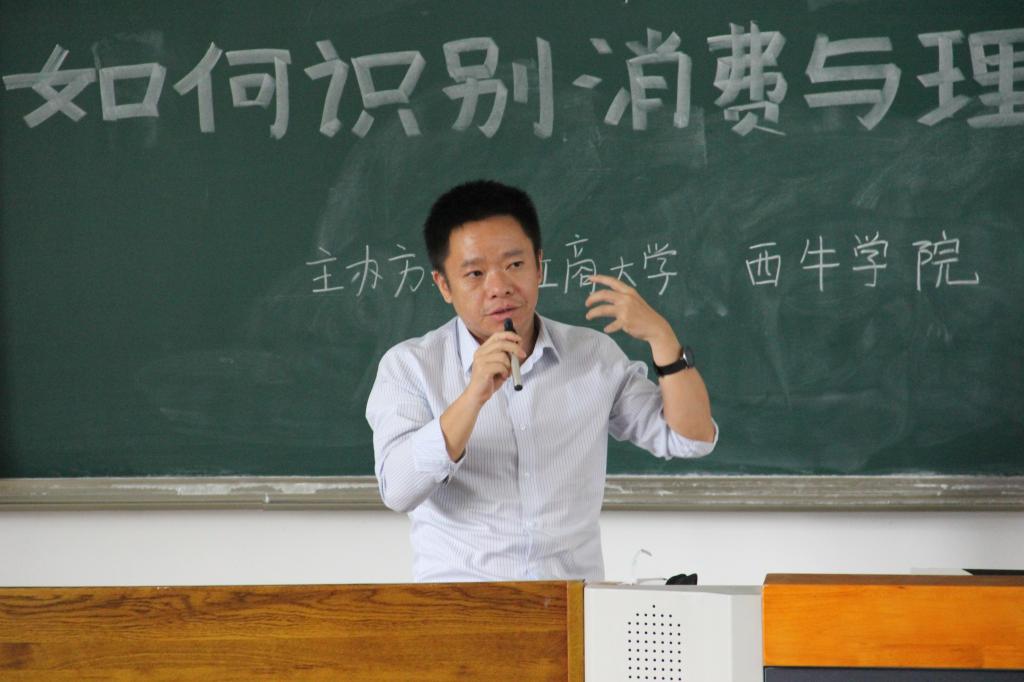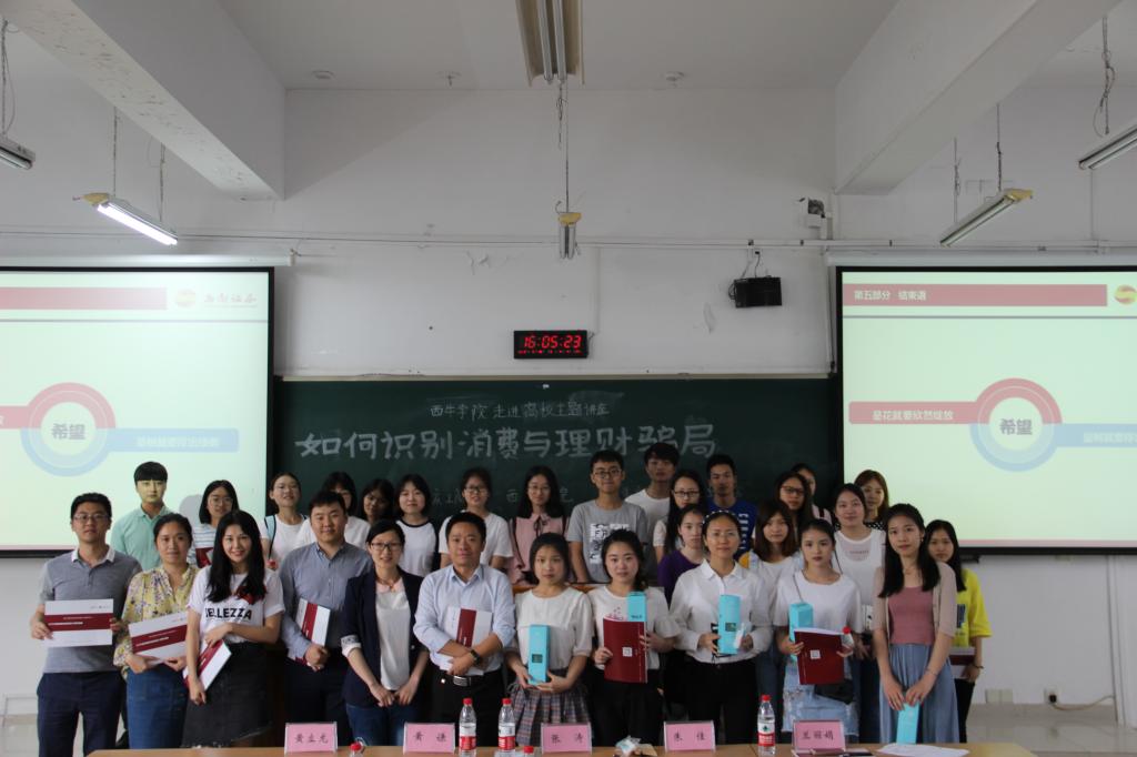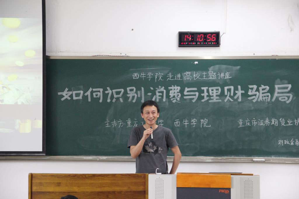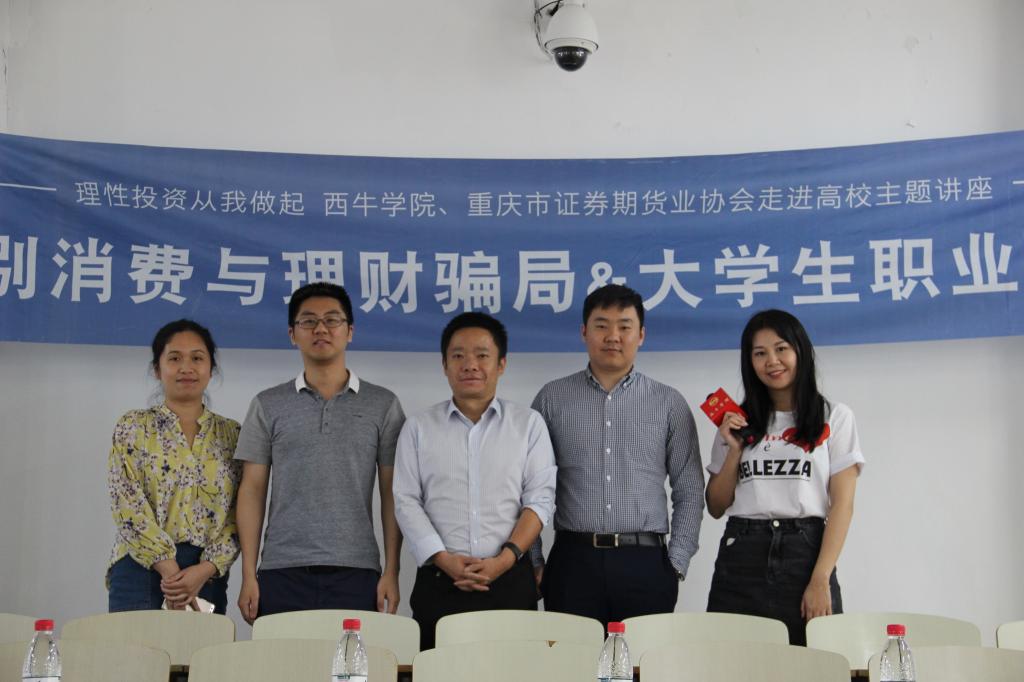 为使大学生了解金融市场风险、提高识别金融骗局的能力,同时为大学生提供就业规划、职业发展的指导与建议,5月18日下午2点,西南证券国家级互联网投教基地“西牛学院”、重庆市证券期货业协会和beat365在线唯一官网财政beat365在线唯一官网在博智楼207联合举办了“如何识别消费与理财骗局暨大学生职业发展交流”的主题讲座。西南证券财富管理中心副总经理张涛、西南证券财富管理中心产品经理黄立龙、重庆市证券期货业协会培训部主任朱佳、财政beat365在线唯一官网分党委副书记黄谦以及学团办主任兰丽娟作为嘉宾莅临了本次讲座。