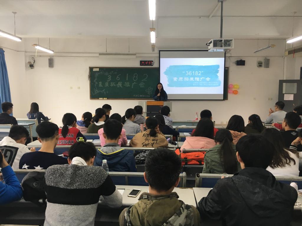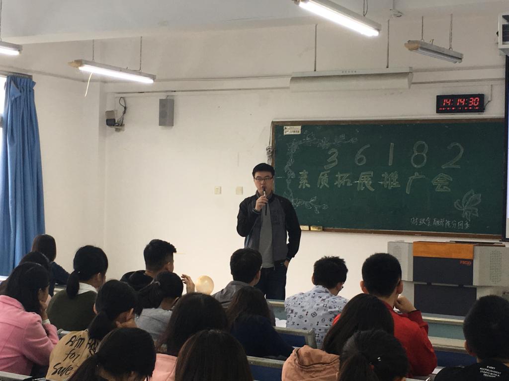 为全面提高大学生的综合素质,培养学生勤奋学习、勇于创新的精神,开辟一条锻炼自我、走向成功的道路,学校特别制定并逐步完善了《beat365在线唯一官网素质拓展第二课堂活动学分管理办法》,将“36182”素质拓展工程贯彻落实到16级新生中去。2016年10月15日下午,“36182”素质拓展推广会在博智楼403如期举行。财政beat365在线唯一官网分团委学生会副主席庞世强、校学生会素拓部部长何凯萌、财金学院分团委学生会素拓部部长陈曦曦、余柔芳出席活动。
