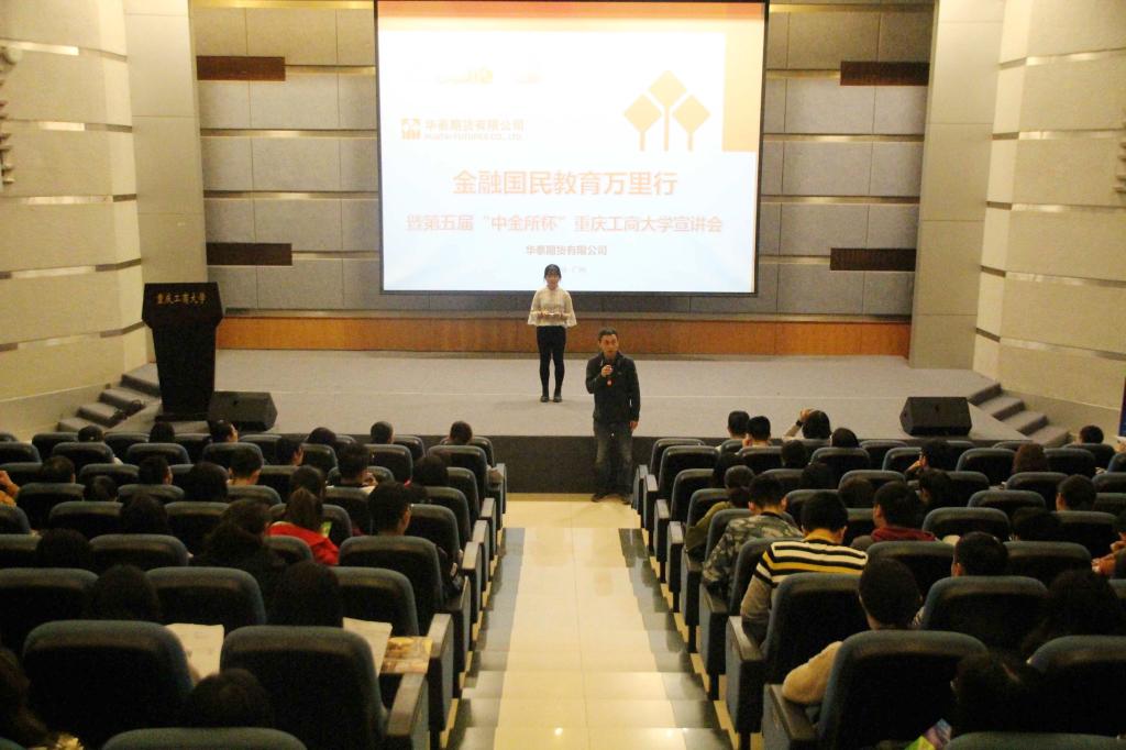 为了培育行业后备人才,促进高校将大赛与学科建设及学生学业挂钩;促进学生了解和学习金融衍生品知识,让学生在比赛中得到学习和提升,2017年4月21日下午2:00,第五届“中金所杯”beat365在线唯一官网宣讲会在南岸校区07100准时举行。华泰期货重庆营业部销售总监万鹏先生、华泰期货重庆营业部陆彦女士,财政beat365在线唯一官网党委副书记黄谦、分团委书记徐阔、学科竞赛指导老师余红霞出席此次大会。