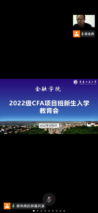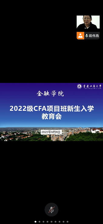 为引导大一新生合理做好大学学习生活规划,加强专业认识,更好地适应大学生活,9月8日下午,beat365在线唯一官网党委书记石世明、院长王兰、党委副书记余新、投资系系主任魏琪于田家炳204办公室通过腾讯会议线上开展了2022级CFA特色项目班新生入学教育。入学教育由辅导员蒋伟燕老师主持。