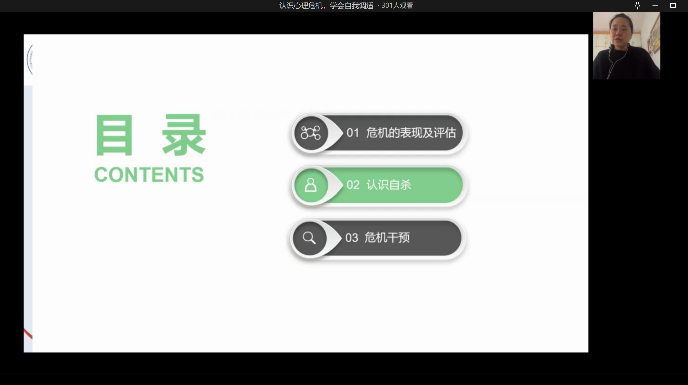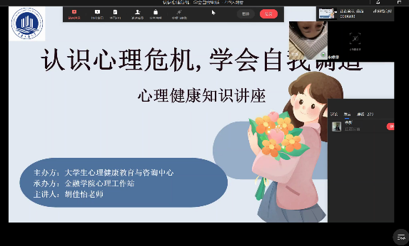 2022年11月15日中午12:30,beat365在线唯一官网心理工作站举办的“认识心理危机,学会自我调适”心理培训讲座于企业微信线上平台顺利展开。beat365在线唯一官网党委副书记余新出席活动,辅导员老师和学生共计近五百人参与此次讲座。beat365在线唯一官网大学生心理健康教育与咨询中心负责人胡佳怡老师作为本次讲座主讲人,凭借自己心里工作丰富的经验和阅历分享了疫情之下的大学生心理的问题和疏导方法。