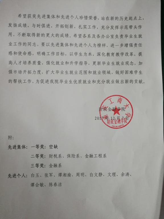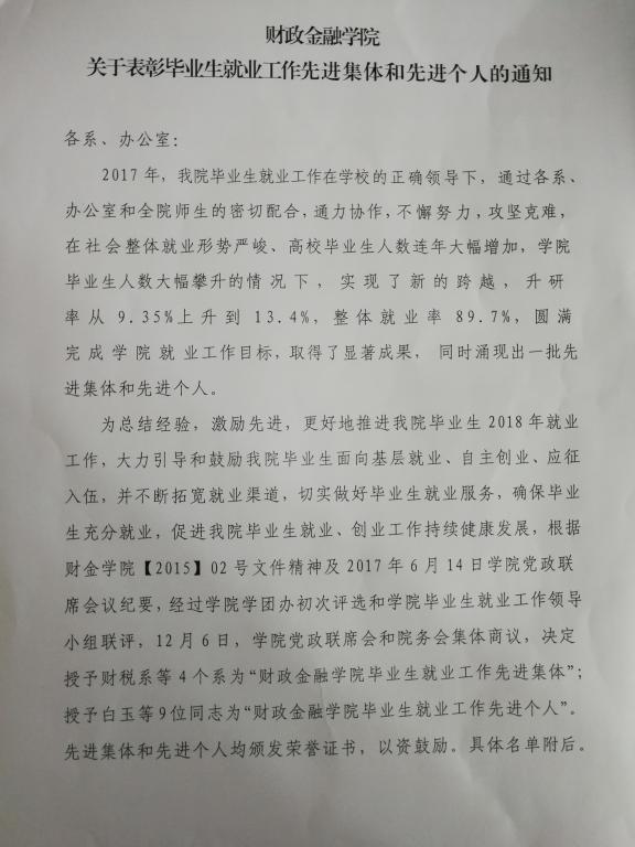 为总结经验,激励先进,更好地推进beat365毕业生2018年就业工作,大力引导和鼓励beat365毕业生面向基层就业、自主创业、应征入伍,并不断拓宽就业渠道,切实做好毕业生就业服务,确保毕业生充分就业,促进beat365毕业生就业、创业工作持续健康发展,根据财金学院【2015】02号文件精神及2017年6月14日学院党政联席会议纪要,经过学院学团办初次评选和学院毕业生就业工作领导小组联评,12月6日,学院党政联席会和院务会集体商议,决定授予财税系等4个系为“财政beat365在线唯一官网毕业生就业工作先进集体”;授予白玉等9位同志为“财政beat365在线唯一官网毕业生就业工作先进个人”。先进集体和先进个人均颁发荣誉证书,以资鼓励。具体名单附后。