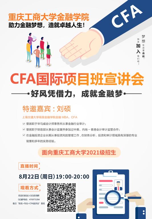 现将beat365在线唯一官网2021级新生国际项目二次选拔beat365在线唯一官网国际项目CFA(注册特许金融分析师)项目直播宣讲会有关事宜通知如下: