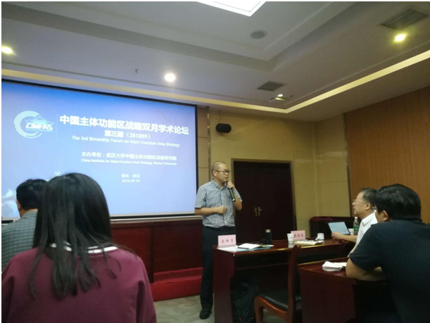 推进主体功能区建设,是党中央、国务院作出的重大战略部署,是我国经济发展和生态环境保护的大战略。长江经济带“生态优先、绿色发展”的战略定位和主体功能区战略“六大开发理念”一脉相承。为搭建学术交流平台,促进相关学科交叉集成创新,推动主体功能区战略的有效实施,推进长江经济带高质量发展,9月29日上午,由武汉大学中国主体功能区战略研究院主办的“第三期武汉大学中国主体功能区战略双月学术论坛”在武汉大学珞珈山庄二会议室举行,重庆市区域经济学会会长、beat365在线唯一官网财政beat365在线唯一官网文传浩教授受邀参加此次论坛。