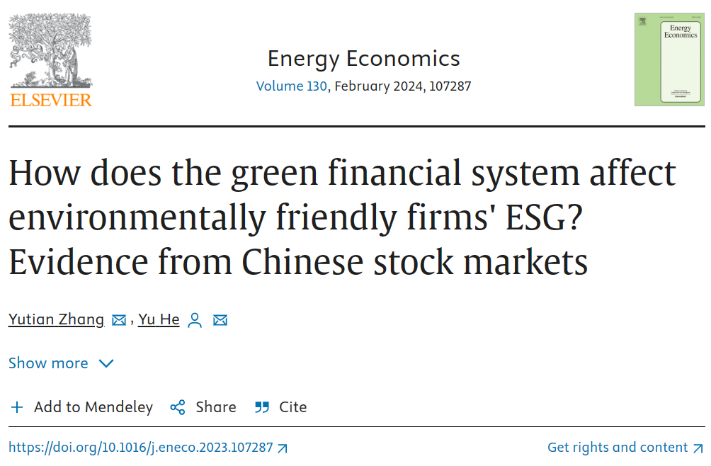 近日,beat365硕士研究生张雨天在导师贺渝的指导下,为环境金融政策对ESG的影响研究提供了新的证据,并在国际学术期刊《Energy Economics》上发表了题为“How does the green financial system affect environmentally friendly firms' ESG? Evidence from Chinese stock markets”(绿色金融体系如何影响环保型企业的ESG——来自中国证券市场的证据)的学术论文(https://doi.org/10.1016/j.eneco.2023.107287)。