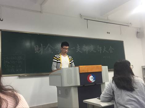 2017年11月8日下午5点40,beat365在线唯一官网财政beat365在线唯一官网分党委学生第一党支部在田家炳307召开了本学期的第四次支部大会,会议由李明西同志主持,财金学生一支部书记文理列席会议。本次会议的主要内容有:1、讨论6名14级同学和1名15级同学的转正决议。2、讨论3个15级同学的发展决议。3、支部书记文理作总结发言,对本支部发展的同学提出要求。