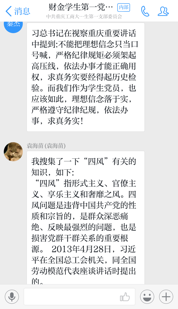 2019年2月18日,财金学生第一党支部组织全体党员进行了寒假第二次交流学习。本次学习由赵利国同志主持,支部全体党员同志参与。交流学习内容包括:1.学习习近平总书记视察重庆重要讲话、习近平总书记参加重庆代表团审议时重要讲话以及习近平总书记关于进一步纠正“四风”、加强作风建设的重要指示等精神2.由黄丽媛同志分享并简单介绍热点新闻:“国家发文!一大批普通本科高等学校将向应用型转变”。