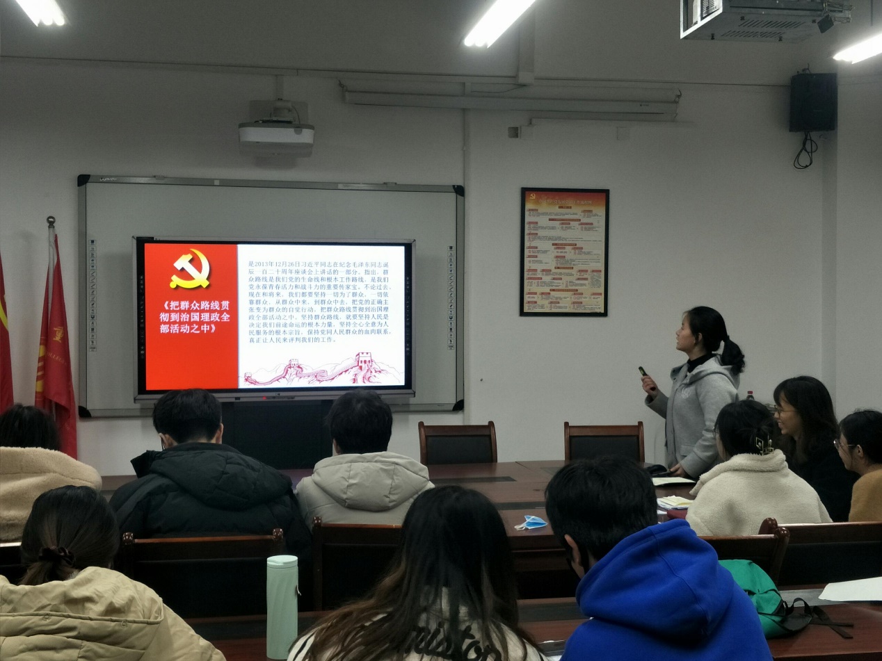 首先由王尤嘉小组介绍习近平总书记关于党的百年奋斗重大成就和历史经验重要论述综述。其次由黎文泽小组介绍学习习近平总书记在第四届中国国际进口博览会开幕式上的主旨演讲,学习贯彻党的十九届六中全会精神——加快建设教育强国。胡京环小组介绍中国共产党重庆市第五届委员会第十一次全体会议决议。李雨檬小组进行习近平同志《论坚持人民当家作主》主要篇目介绍,其中包含:《在首都各界纪念现行宪法公布施行三十周年大会上的讲话》、《在第十二届全国人民代表大会第一次会议上的讲话》、《必须充分发挥我国工人阶级的重要作用》等五篇讲话学习。