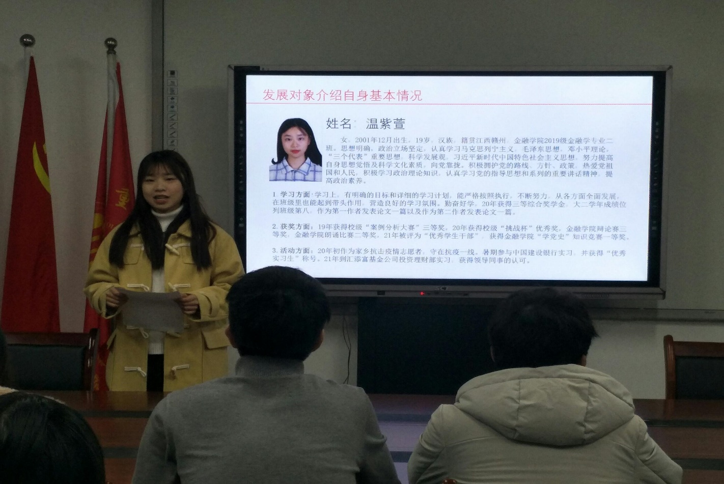 会议第一阶段,接收预备党员大会。会上,付婧一、郭明伟、钟思盈、温紫萱、熊婉淇、黎玥、朱昕雨等7名发展对象,按照接收预备党员流程分别汇报了对党的认识、入党动机、本人履历、家庭和主要社会关系情况,入党介绍人介绍了发展对象有关情况,支部考核意见,全体参会党员无记名投票等环节,经支部大会讨论,一致同意接收以上7名同志为中共预备党员。