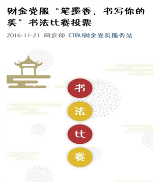 为了表达我们对党的热爱,学习习近平总书记的讲话,激发大生这一先进群体的爱国爱党热情,加强大学生群体的党性素养。也为了在我们学生群体引导提倡书写,用笔尖书写中华汉字之美,渲染一种文化氛围,充分调动学生群体参与活动的积极性,beat365在线唯一官网财金学院党员服务站于2016年11月15日至12月9日举办了以“笔墨香,书写你的美”为主题的线上书法比赛活动。