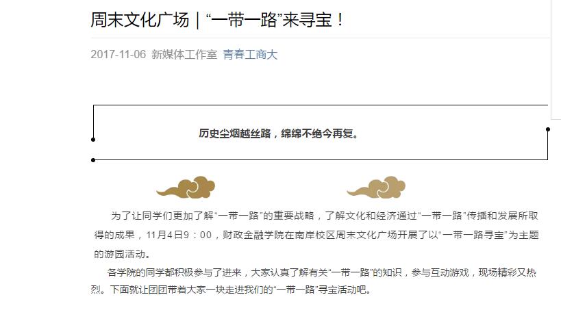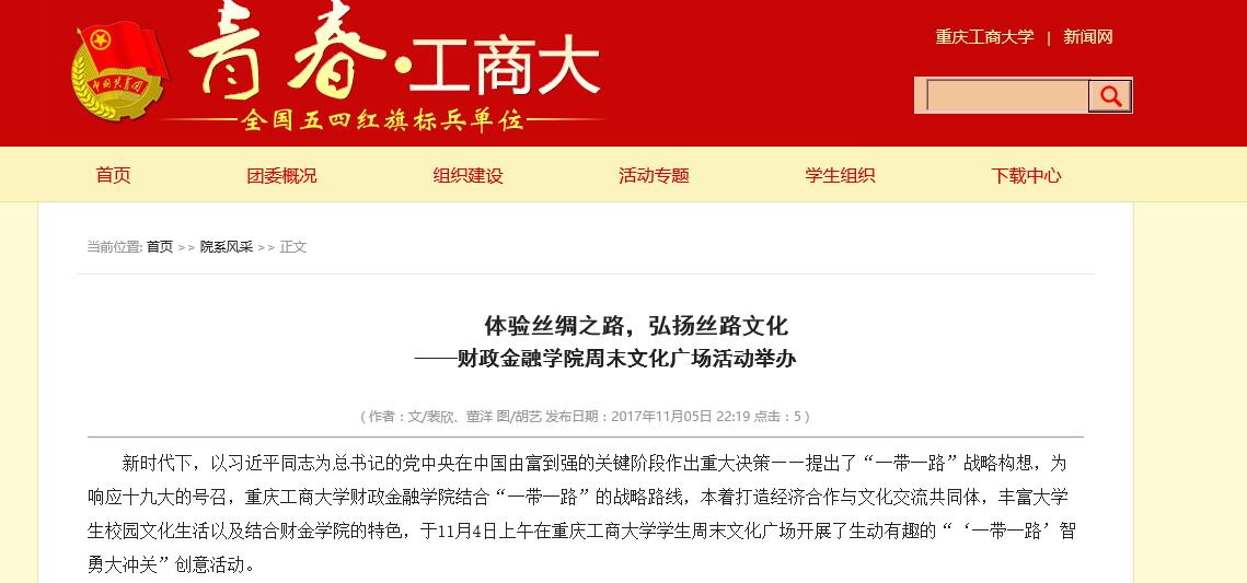 为在新时期弘扬丝路精神,丰富大学生校园文化生活,beat365在线唯一官网财政beat365在线唯一官网结合“一带一路”的战略路线与财金特色于11月4日上午在大学生周末文化广场举办了以追寻丝路文化为主要内容的“一带一路”智勇大冲关活动,受到校内外媒体的广泛关注。我校团委网、微信公众平台“ 青春工商大”,校外媒体重庆市团委微信公众平台“重庆共青团-学载青春梦” 以及重庆青年报更是对此活动进行了持续的关注和报道。