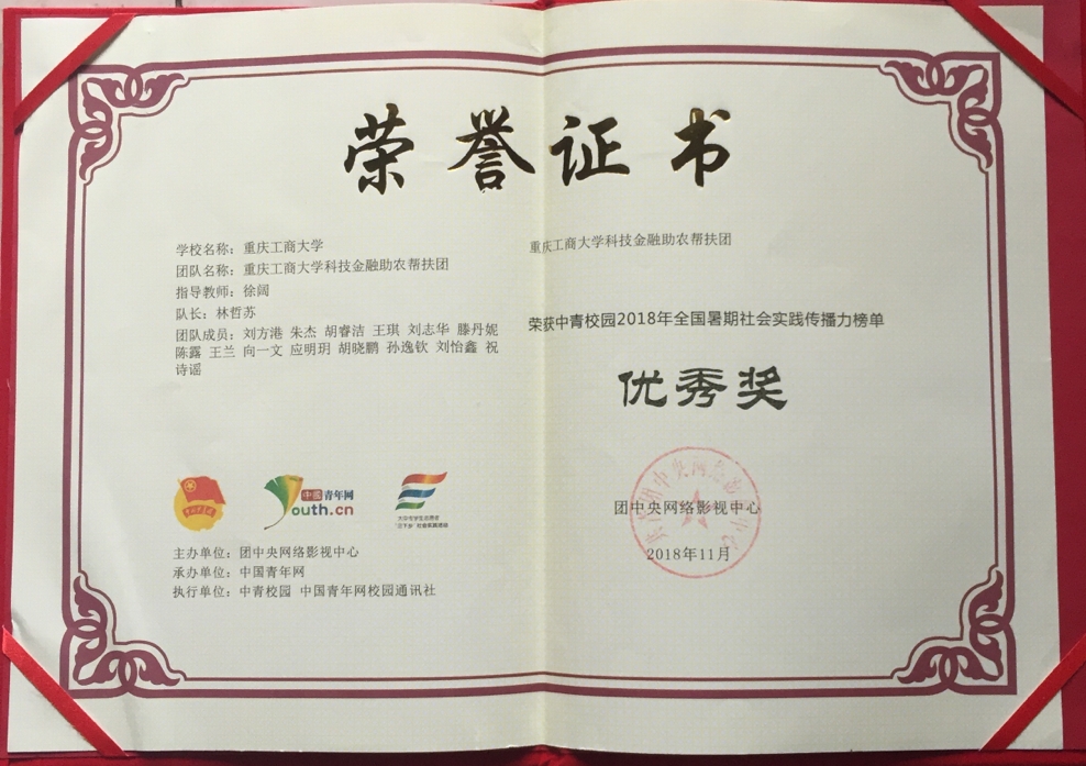 2018年12月19日,由团中央青年发展部、团中央网络影视中心主办,中国青年网、对外经济贸易大学团委承办的2018年“镜头中的三下乡”总结会暨中国青年网校园通讯社通讯站授牌仪式在对外经济贸易大学举行。beat365三下乡团队队长林哲苏赶赴北京参与本次会议。本次会议有300余所高校参加,其中包括清华大学、中央财经大学、华中师范大学、武汉科技大学等其他高校。在本次由团中央举办的2018年“镜头中的三下乡”活动评选中,beat365荣获全国百强传播力团队表彰。