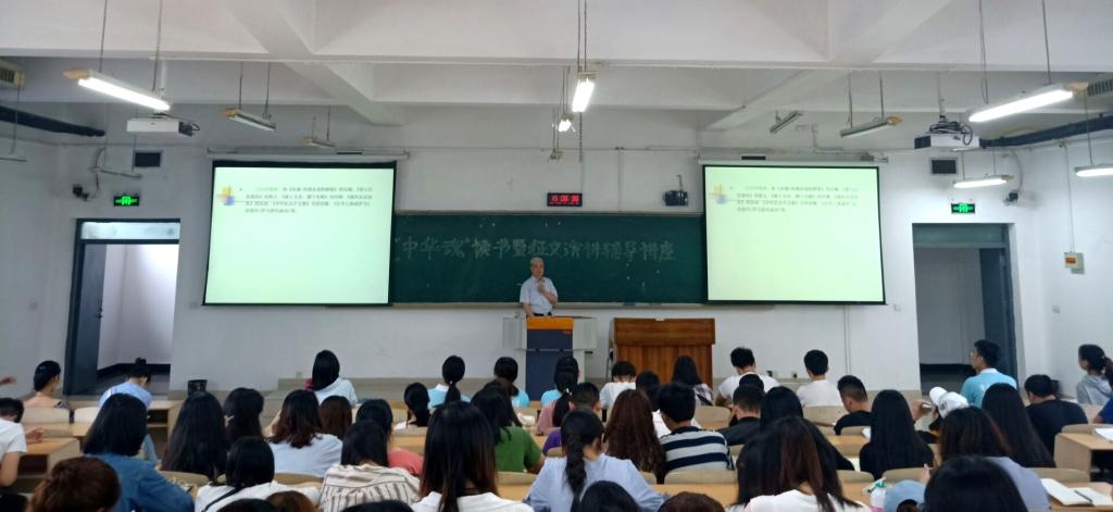 首先,李教授从“中华魂”主题教育读书活动暨征文、演讲比赛的主要安排为同学们介绍了此次比赛的活动目的、活动原则、时间安排、评选奖励办法。此比赛主要是为了激励和引导广大青少年更加紧密地团结在一起,争做民族复兴大任的时代新人。其次,李教授为同学们分享了《热爱中华魂》这本读物并对这本书给予了高度评价,这本书主要由三部分组成:祖国,我为你们骄傲;祖国,我为你喝彩;祖国,我为你奉献。他指出,我们青年学生可以像作者一样,怀着“三个充满”去阅读该读本,怀着“三个充满”去撰写读书征文、演讲稿。随后,李教授介绍了关于写好读书征文、演讲稿的基本要求与方法,指导同学们围绕赞颂共产党好、社会主义好、改革开放好、伟大祖国好、各族人民大团结好的几个主题来进行撰写。最后他对2018年的比赛获奖作品进行了赏析,这些优秀作品为同学们提供了写作借鉴材料。