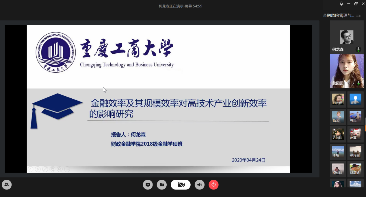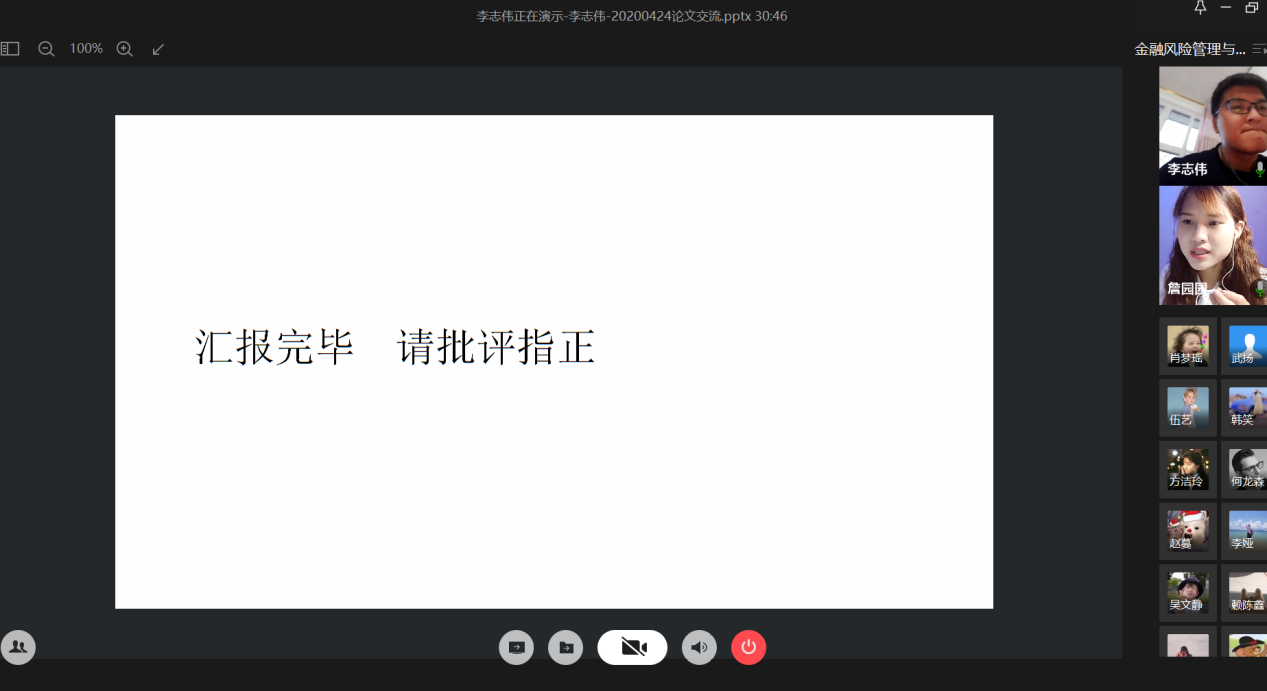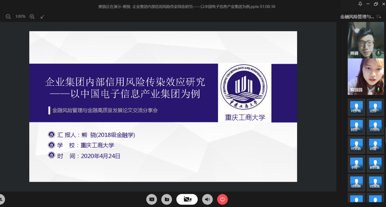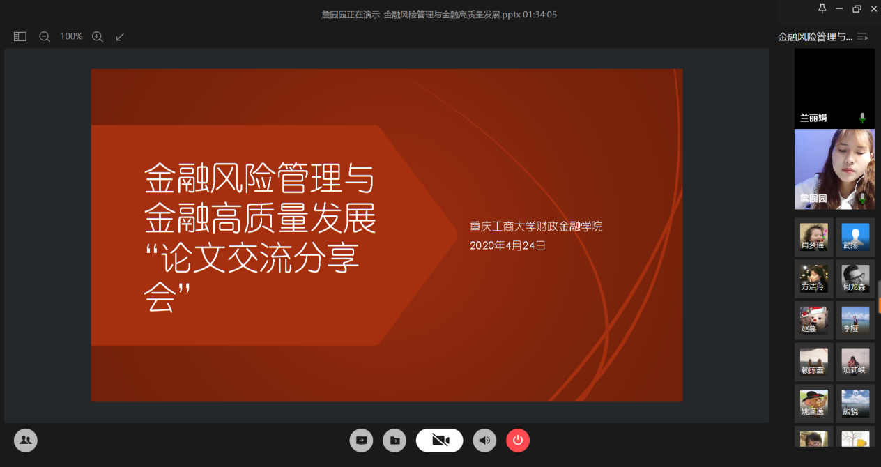 4月24日晚上,财政beat365在线唯一官网研究生分会通过腾讯会议成功举办了“金融风险管理与高质量发现”论文交流会。本次交流会由研分会的文体部部长詹园园主持,18级金融学硕的李志伟、项莉峡、何龙森、熊骁四位同学分享了他们的论文框架及论文写作经验。