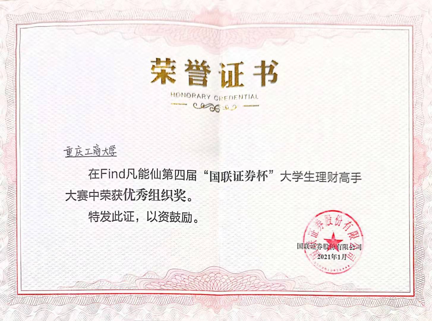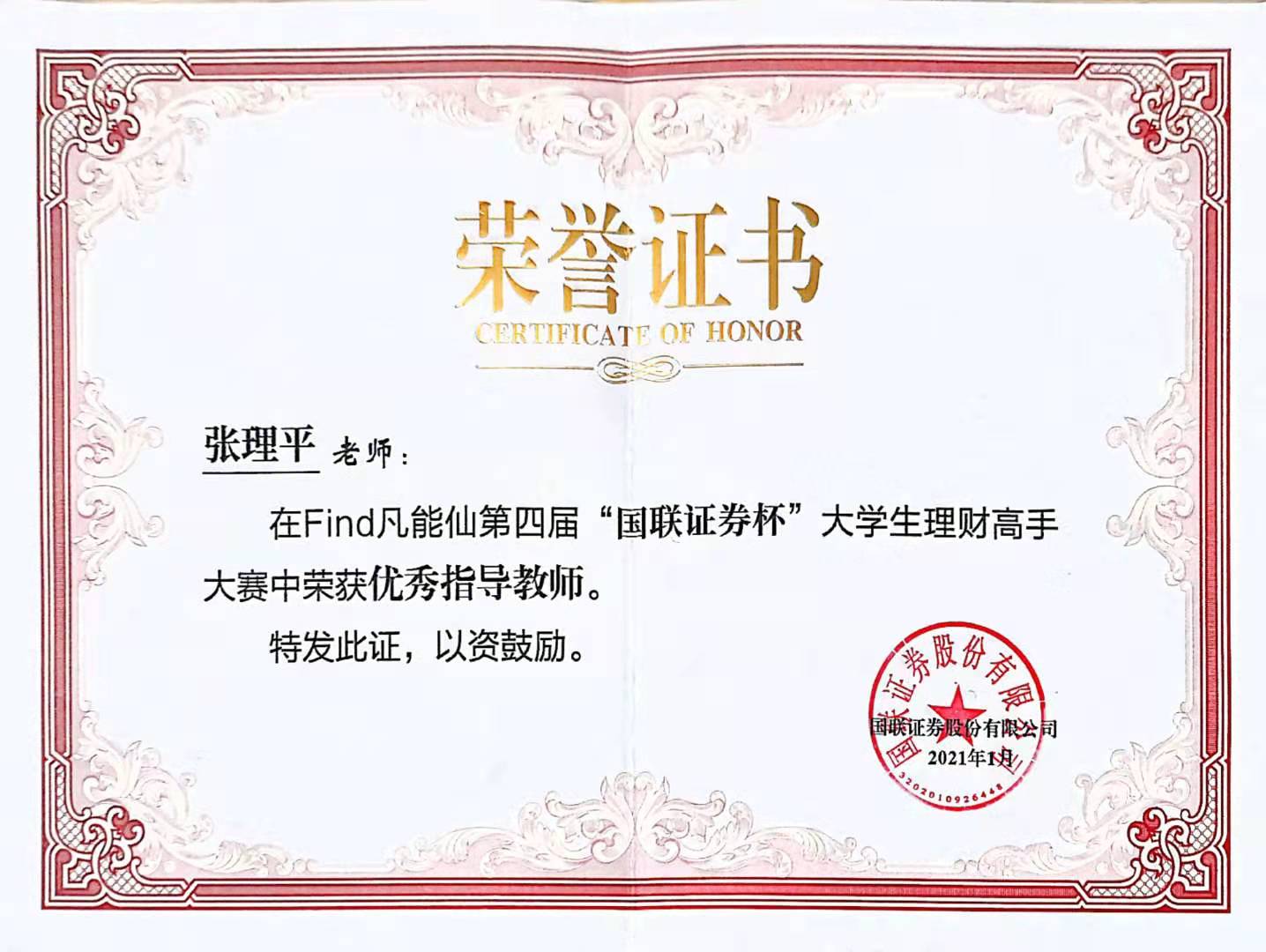 2021年1月10日,第四届“国联证券杯”-Find“凡能仙”大学生理财高手大赛决赛暨颁奖仪式圆满落幕,beat365在线唯一官网代表队荣获“优秀组织奖”。金融工程专业张理平老师荣获“优秀指导教师奖”。在基金理财个人赛中,我校蒋涵月获得“二等奖”,杨松获得“三等奖”,寇力元,许梦茹等同学荣获“优秀奖”。
