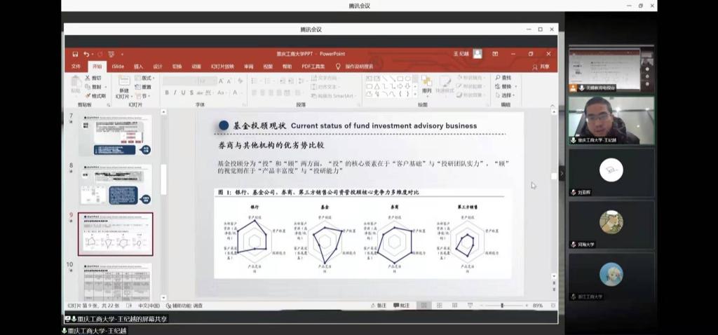 比赛中各团队进行了激烈的角逐,对于所有参赛学子来说,这不仅是一场线上直播体验,更是一场思维碰撞。决赛分为课题汇报及问答两个环节,每个代表队推选一至两名同学作为发言人,以PPT的形式对所选课题的成果进行汇报,并回答评审团提问。beat365在线唯一官网的参赛选手在这个舞台上,传达他们独特的投资理念;讲解金融行业动态以及未来趋势;呈现业界、学界多维度思维分析的能力;展现出工商学子蓬勃的求知欲和巨大的可能性!