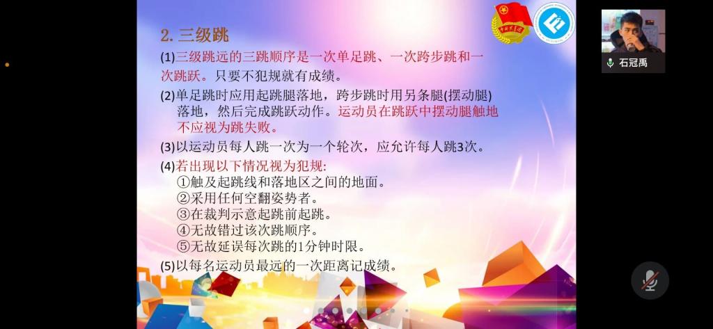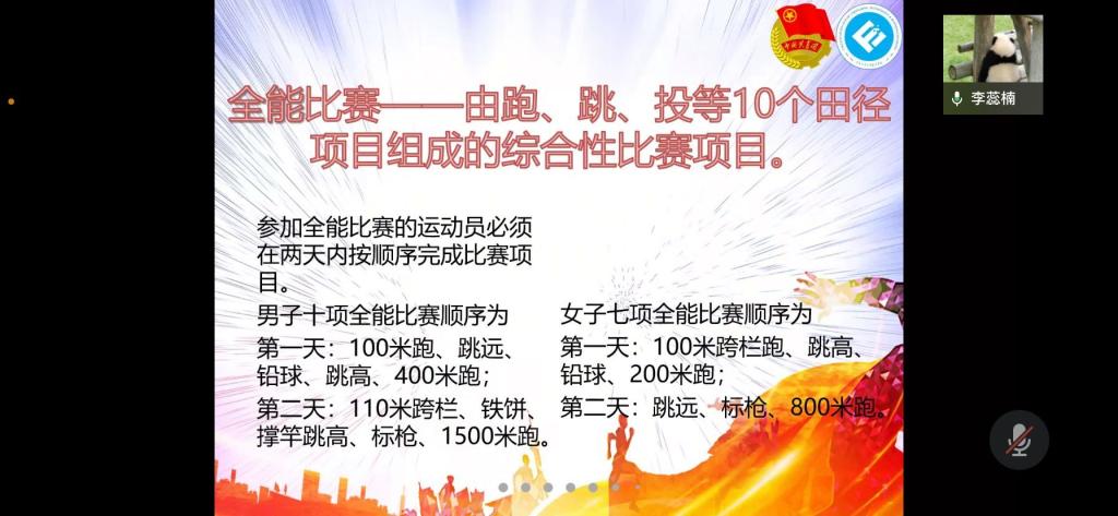 2022年3月18日19时,beat365在线唯一官网体育技能培训大会在企业微信顺利举行。本次会议由beat365在线唯一官网分团委学生会体育部部门负责人熊芯、石冠禹、李蕊楠分别对田径运动径赛、田赛、全能比赛进行介绍,旨在提高同学们的体育知识与技能。