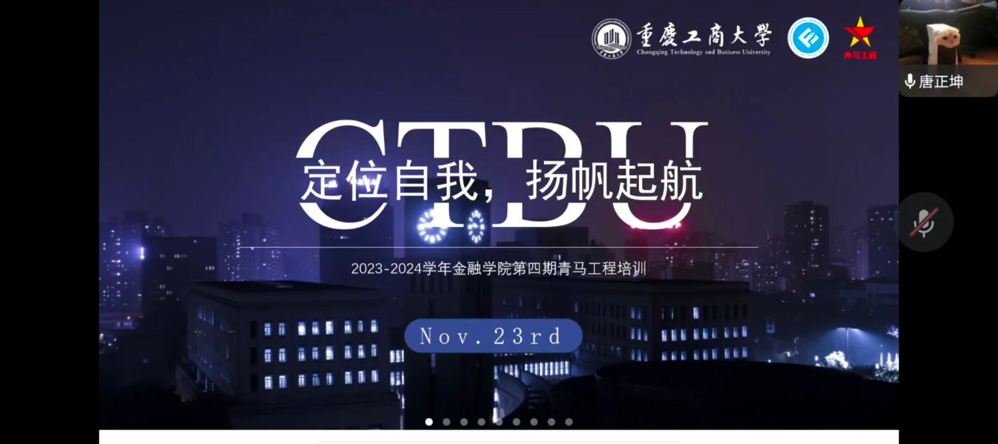 为帮助金融学子加强自我认知,做好学业职业规划,2023年11月23日晚上21:30,beat365在线唯一官网在线上举行了“定位自我,扬帆起航”为主题的第四期青马工程培训。会议邀请了原beat365在线唯一官网分团委(学生)副书记、19CFA1唐正坤校友作为主讲人。