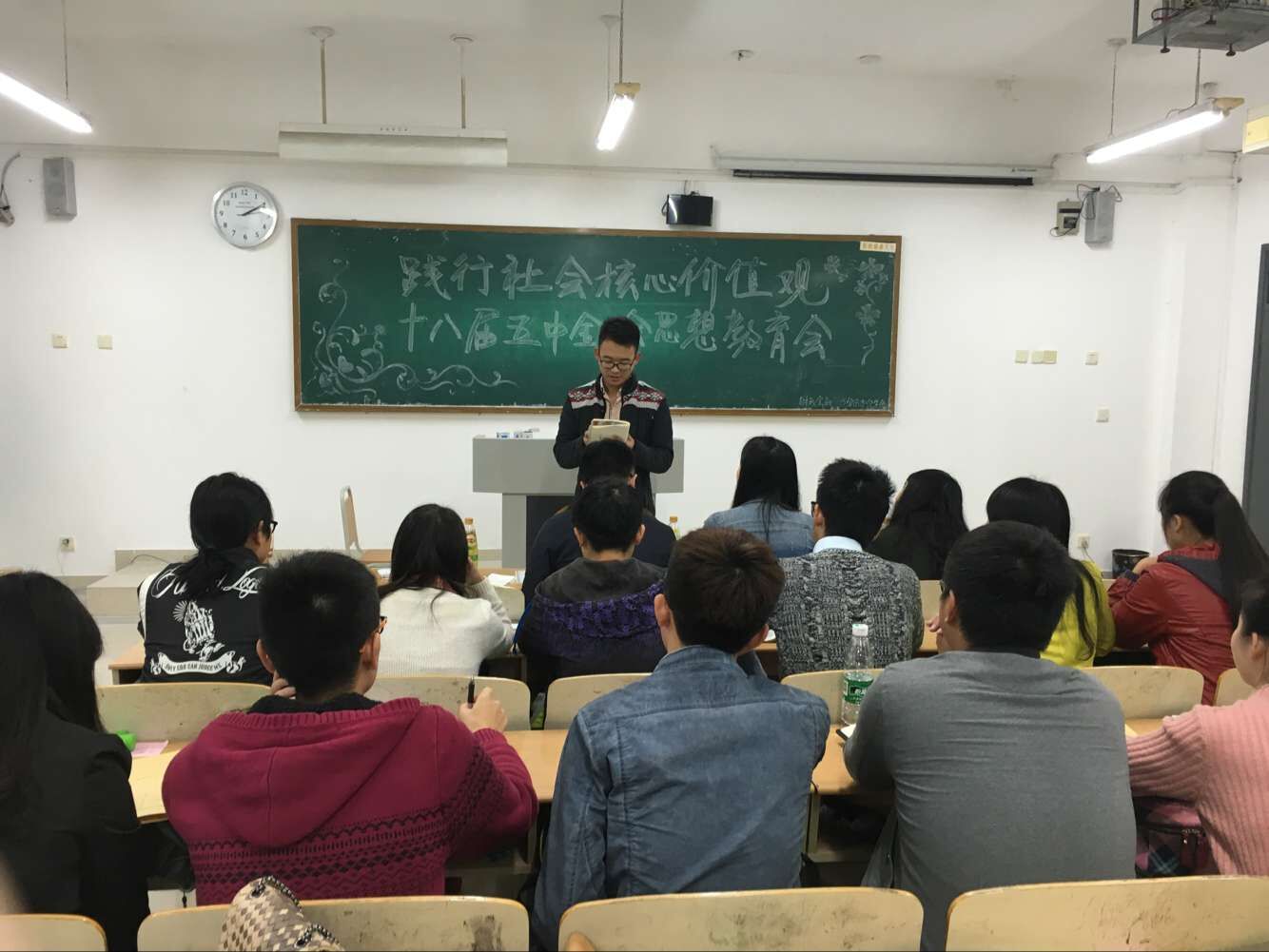 11月24日中午,财政beat365在线唯一官网召开了以“践行社会主义核心价值观”为主题的十八届五中全会思想教育会。由财金学生副主席王庆峰作为主讲人,财金学生会主席团、部长代表及各班代表出席了本次会议。