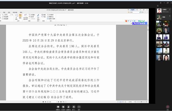组织生活学习主要分为两个阶段:第一阶段为支部委员会议,黎毅、赵甫刚、谭会敏、杨佳妮、李鑫五位同志通过商议决定本次组织生活学习的重点内容为《中国共产党第十九届中央委员会第五次全体会议公报》,并学习了相关主要内容;第二阶段为支部成员会议,通过相关学习,各位党员纷纷结合自身实际工作交流学习体会,其中王韧同志认为全体会议公报深刻体现了习近平新时代中国特色社会主义思想,具有时代价值和实践要求。我国在“十三五”决胜全面建成小康社会阶段取得决定性成就,尤其是今年新冠肺炎疫情防控取得重大战略成果,充分展示了中国共产党领导和社会主义制度的优越性,充分诠释了把人民利益摆在至高无上地位的深刻内涵,充分彰显了我国独特的政治优势、制度优势和发展优势。李鑫同志表示我国已转向高质量发展阶段,继续发展具有多方面优势和条件,但我国仍然面临错综复杂的国际形势、 艰巨繁重的国内改革发展稳定任务,作为新时代年轻教师,更要勇挑重担,积极投身新时代中国特色社会主义的伟大实践,需自觉将思想淬炼和实践锻炼同自身教学科研工作结合起来,不断提高解决在实际工作中问题的能力。