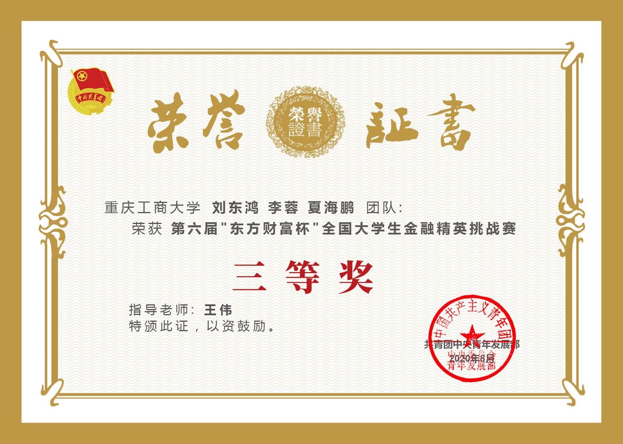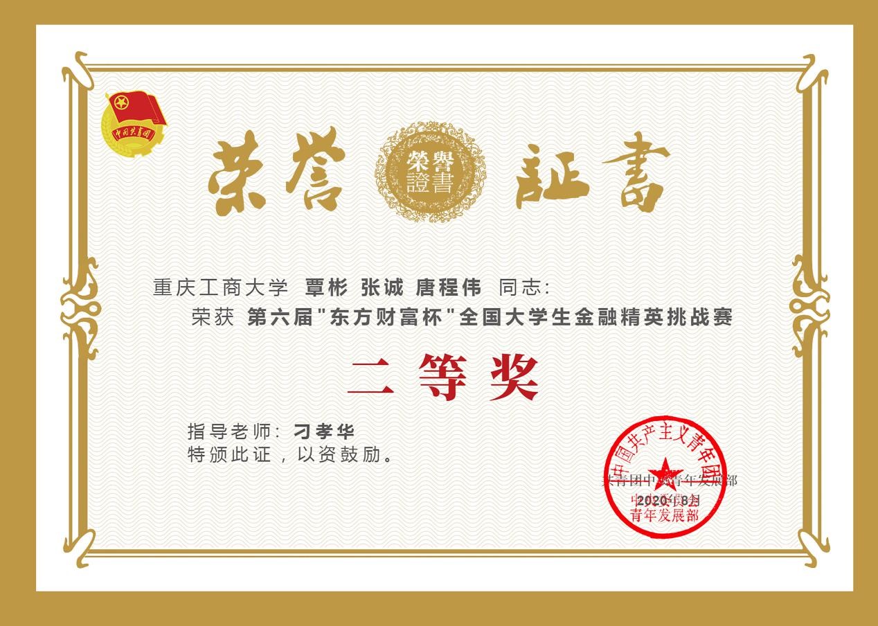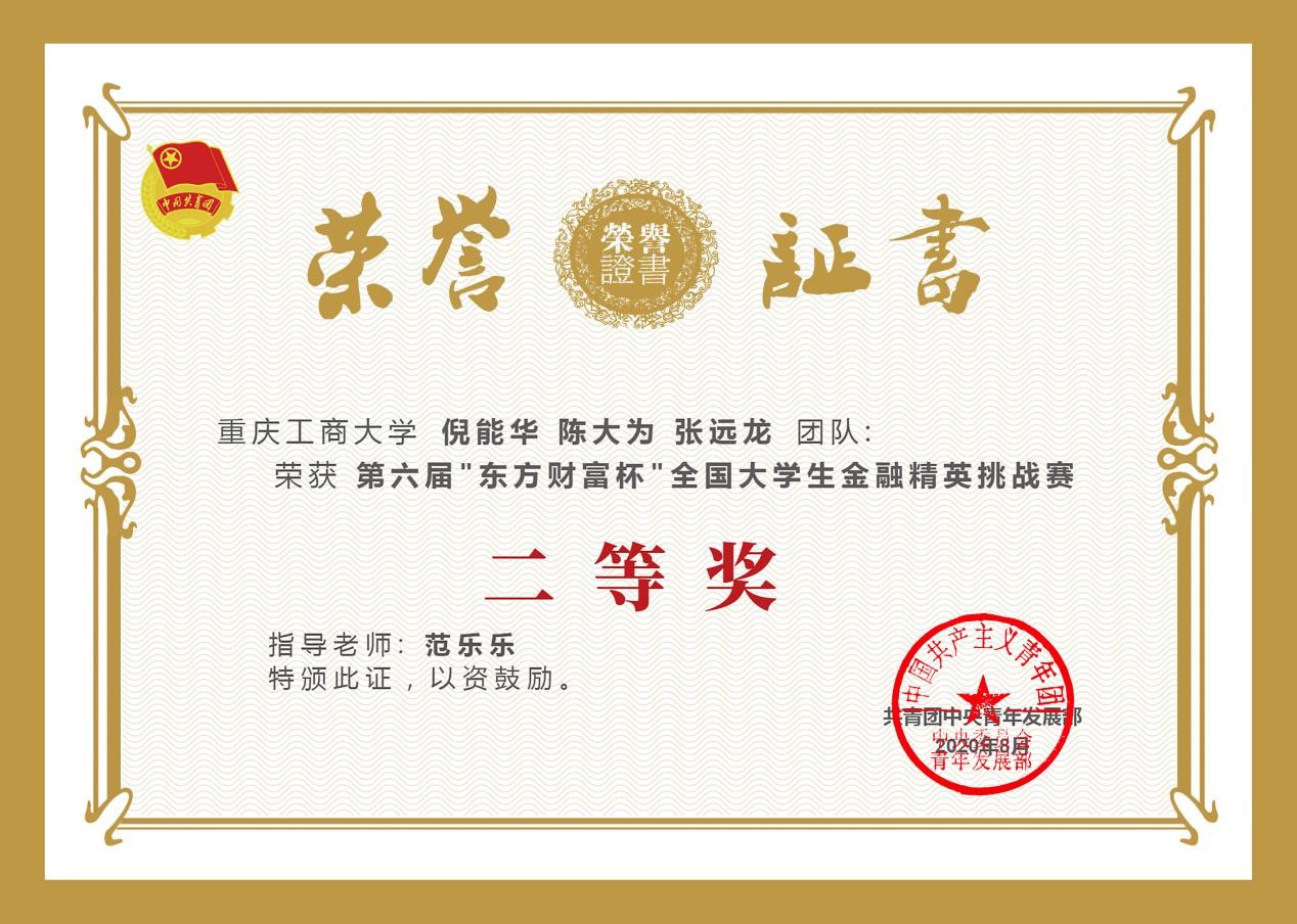 2020年8月21日,由共青团中央青年发展部主办,东方财富信息股份有限公司、全国学校共青团研究中心联合承办的第六届“东方财富杯”全国大学生金融精英挑战赛国赛圆满落幕。beat365在线唯一官网共541人参赛,经过校赛、省赛、国赛的激烈比拼,14支优秀团队脱颖而出,获得全国奖。其中1支团队荣获一等奖,9支团队荣获二等奖,4支团队荣获三等奖;其中beat365在线唯一官网1支团队荣获一等奖,4支团队荣获二等奖,3支团队荣获三等奖。