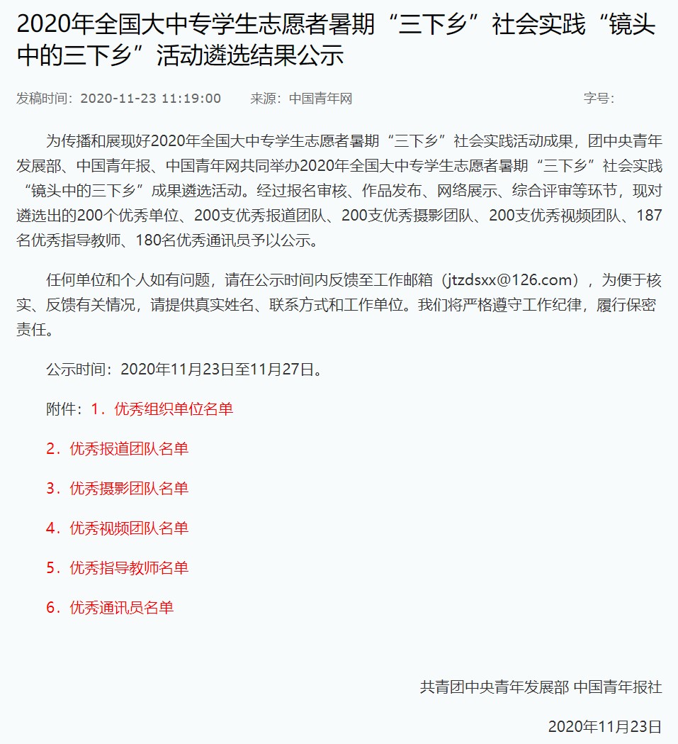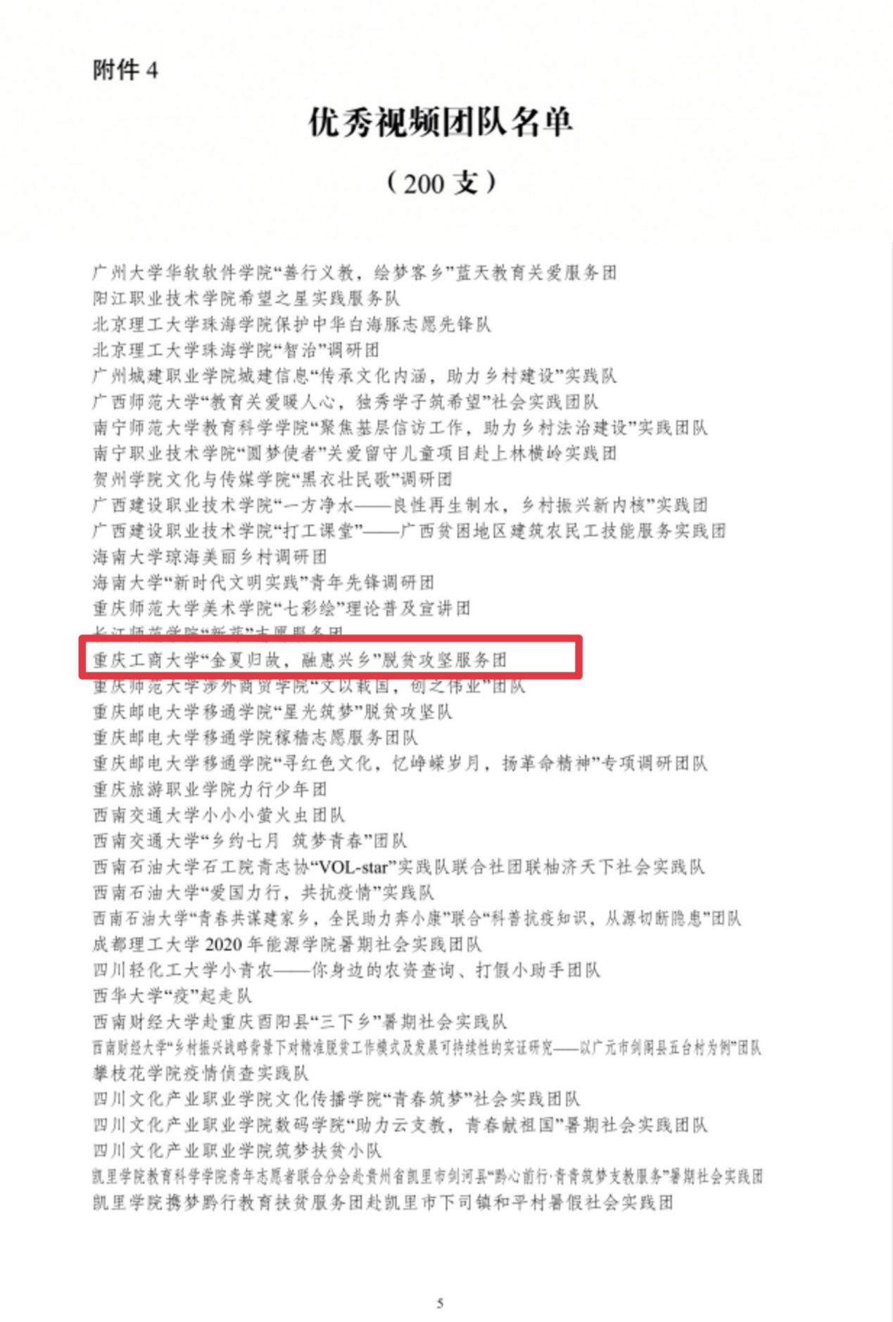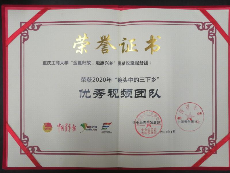 2020年11月23日,团中央青年发展部、中国青年报、中国青年网共同举办2020年全国大中专学生志愿者暑期“三下乡”社会实践“镜头中的三下乡”成果遴活动结果公示,beat365暑期“三下乡”社会实践团队——“金夏归故,融惠兴乡”脱贫攻坚服务团荣获“全国优秀视频团队”荣誉称号。