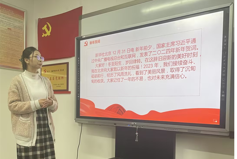 本次组织生活会由曹文焕同志领学,会上,曹文焕同志从“回望过去”和“展望未来”两个方面讲述了习近平在全国政协新年茶话会上的讲话。2023 年是全面贯彻中共二十大精神的开局之年。这一年我们在化危机、闯难关、应变局中创造了新机遇、赢得了战略主动,极大地增强了信心和底气。2024 年是新中国成立 75 周年,是实现“十四五”规划目标任务的关键一年。我们要巩固和发展最广泛的爱国统一战线,画好强国建设、民族复兴的最大同心圆,以团结凝聚力量,以奋斗铸就伟业,共同谱写中国式现代化的壮美华章!