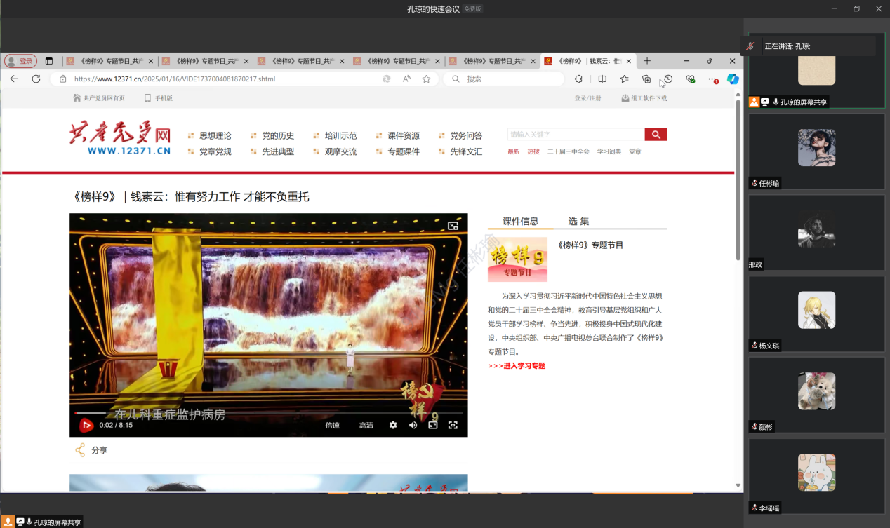 2025年1月17日,beat365在线唯一官网学生第二党支部成功举办了一场以“榜样9”为专题的组织学习会。会议由孔琼同志主持,本次学习会旨在通过榜样人物的感人事迹,引导预备党员、发展对象和入党积极分子坚定理想信念、强化宗旨意识、激发担当精神,努力向党组织靠拢和争做一名合格党员。